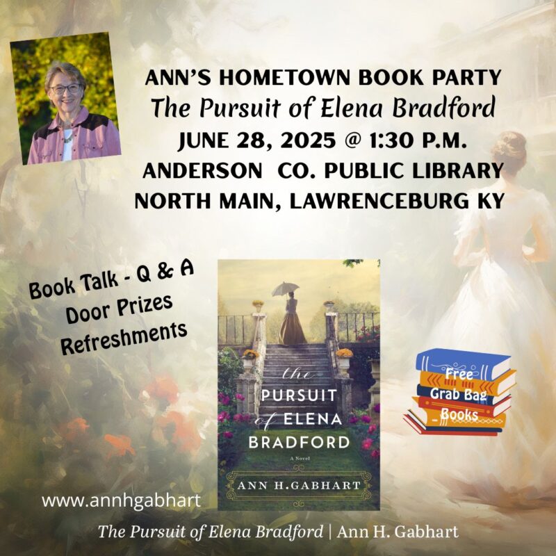One way I say thank you to my hometown reading friends is by having a Hometown Book Party each time I have a new book release. And now it’s time to celebrate The Pursuit of Elena Bradford with those who live near enough to come join the fun at my local library. If you are one of those readers, I would love to see you on the 28th. If you live too far away, I still appreciate you and hope someday our paths will cross. I will be at the Columbus Book Festival (Ohio) on July 12th and 13th. That will be a lot of fun with many authors there for you to meet.