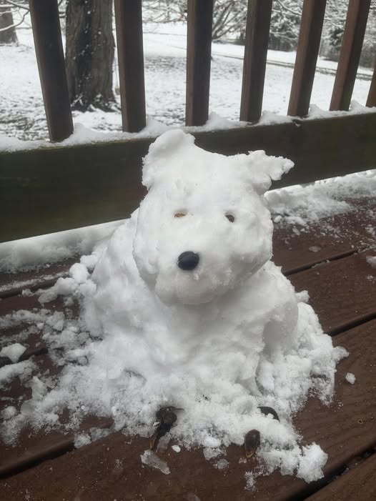 I’ve built several snowmen since I left childhood days behind. Usually like that day with a kid or a grandkid. But once when it snowed in March and then turned sunshiny and rather balmy, I went out and played in the snow by myself. I made a snowman and snow woman and their dog. The snow was just too perfect for snowman building to waste that day. I guess I felt the same Monday when I made my cat/dog/bear or whatever on the deck Monday.